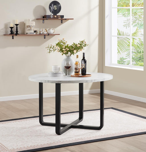Off White Faux Marble Table Top, Ebony Black Table Base, X Style Table Base, Solid Wood Construction D180 - Melamin Round Dining Table - Black / Wh...