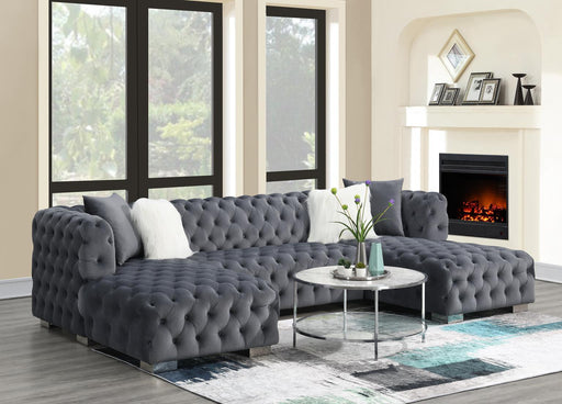 All Around Button Tufting, Gray Luxurious Velvet, Squared Back and Arms, Chrome Feet, Faux Fur Accent Pillows U287 - 3 Piece Sectional (Two Chaises...