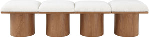 Bring valuable seating and remarkable style to your space with this Pavilion boucle fabric bench, an exquisite balance of style and usability for the entryway, bedroom, and beyond. Crafted from oak veneer with a walnut brown finish, this bench has a 4-inch-thick seat cushion that's channel-tufted for a touch of luxury. The bench's columnar bases add a dash of art deco design, making it a captivating focal point in any room.