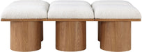 Bring valuable seating and remarkable style to your space with this Pavilion boucle fabric bench, an exquisite balance of style and usability for the entryway, bedroom, and beyond. Crafted from oak veneer with a walnut brown finish, this bench has a 4-inch-thick seat cushion that's channel-tufted for a touch of luxury. The bench's columnar bases add a dash of art deco design, making it a captivating focal point in any room.