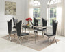 10mm Tempered Black Glass Top, Chrome Table Legs & Glamour Styled Design, Luxurious Velvet, Chrome Chair Frame & Elegant Style Chair Legs, Capability to Fit up to 8 Chairs, Coordinates with G-100-S, G-102-S, G-106-S Side Chairs
