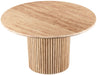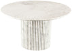 Add a refined look to your room with this handcrafted Genoa dining table, a stunning masterpiece that marries elegance and practicality. Crafted from genuine travertine, each table is a unique work of art, featuring a beige travertine top with intricate white veining. The fluted travertine base adds a touch of art deco design, making it a statement piece in any room and adding to its heirloom-quality design.