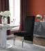 Bring the luxe look of this Porsha chair to your dining space. Impressing guests is simple when they're seated in this chair. The floor-length back is elegantly beautiful and creates a striking silhouette from every angle. upholstery material in a sophisticated hue of adds a touch of modernity to this chair, and the reverse is channel tufted for added elegance and refinement. legs complete the look for added contemporary panache and sturdy support.
