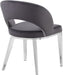 Seat dinner guests in elegant style with the Roberto velvet dining chair from Meridian Furniture. This fabulous chair features a rounded back with strategically placed opening for visual beauty and to allow air flow while you dine. The rich upholstery is chic and modern, and it has a soft feel against the skin. This chair rests on iron legs for superb support, and each leg is finished in for a modish slant that meshes well with your up-to-the-minute dining room decor.