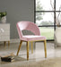 Seat dinner guests in elegant style with the Roberto velvet dining chair from Meridian Furniture. This fabulous chair features a rounded back with strategically placed opening for visual beauty and to allow air flow while you dine. The rich upholstery is chic and modern, and it has a soft feel against the skin. This chair rests on iron legs for superb support, and each leg is finished in for a modish slant that meshes well with your up-to-the-minute dining room decor.