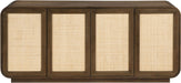 Brown textures take center stage with the Windsor Brown solid wood and cane sideboard. Framed in smooth, rounded durable wood and detailed with airy cane panels, this mid-century modern buffet balances form and function with effortless ease. Perfect for dining rooms, entryways, or living spaces needing a soft, organic touch.