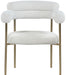 Comfort comes to mealtime with this Blake boucle fabric dining chair. This lovely chair is just the right choice for your modern dining room, with its curved back that cradles you in comfort while you wine and dine the night away. A thickly padded soft boucle fabric seat lends this chair a sleek, upscale look while ensuring its ongoing performance and beauty. The chair's brushed brass finish protects its all-metal iron frame.