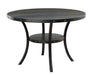 The Crispin Dining Table features a 48" round table top that easily accommodates 4 person seating. It is crafted of solid wood and manufactured wood and features a scratch, water and heat resistant melamine top. Study metal legs that add character and long-lasting quality highlight the contrasting trim with nailhead accents that circles the dining table. The unique wire brushed table top treatment highlights the smoky browns, black and grays in the wood finish. The handy storage shelf below the table top adds support and function. Perfect for dining rooms, kitchen nooks, media rooms-any where you need a casually rustic, durable and comfortable gathering table.