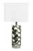 This table lamp is a contemporary gem, featuring a base with a distinctive geometric pattern that adds a three-dimensional, tactile experience to its surroundings. The metallic finish of the base reflects light and contributes to its modern, industrial charm. Above, a clean, crisp white shade presents a stark contrast, offering a classic touch to balance the lamp's edgy base. This piece provides not only illumination but also serves as a statement decorative object, ideal for modern living rooms, chic offices, or as a striking accent in a minimalist bedroom.
