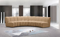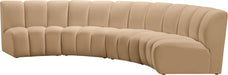 Create a seating group that works for every possible situation with this Infinity modular 4-piece sectional and other pieces in the Infinity collection. Upholstered in soft Camel velvet material that feels great against the skin and offers long-wearing beauty, this piece fits with other Infinity items for an infinite number of combinations that get your seating requirements just right but that look just as nice when used on their own.