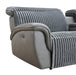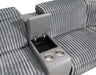 Gray Corduroy Fabric Dual Side Power Reclining, USB Ports, Contrast Stitching, PU Leather Sides, Back, Adjustable Headrest, Reenforced Steel Reclining Mechanism, Stainless Steel Cup Holder Inserts