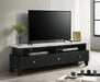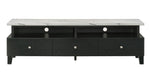 Embrace modern sophistication and functionality with this stunning entertainment console, designed to be the centerpiece of any contemporary living space. Featuring a sleek dark finish with an elegant faux marble top, this piece combines luxury and practicality. The robust construction ensures durability while providing ample storage for all your media needs. It offers generous shelving spaces and smooth-gliding drawers accented with chic, minimalist handles. Elevated on sturdy block legs, this console not only enhances the visual space of your room but also keeps your entertainment area tidy and stylish.