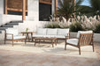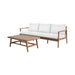 The Ashton Patio Set seamlessly blends durability, comfort, and timeless design to create the ultimate outdoor retreat. Expertly crafted from FSC-Certified Acacia solid wood, this set offers exceptional strength and natural resistance to the elements, ensuring long-lasting beauty and reliability. A meticulously applied light, clear multistep finish enhances the wood''s rich texture and color while adding a protective layer for superior outdoor durability. The sofa is designed for lasting comfort with plush, high-density 12cm foam seat and back cushions, upholstered in exclusive Sundura™ fabric—a solution-dyed 100% polyester that resists fading, mildew, and moisture, keeping the set vibrant and fresh year after year. With clean, straight lines, slatted backs, and a low-profile frame, this minimalist design delivers sleek functionality and modern elegance. The slatted tabletop not only adds a classic touch but also improves water drainage for practical outdoor use. Each piece showcases one-of-a-kind wood grain variations, offering unique patterns and organic details that bring timeless beauty and authentic charm—ensuring no two pieces are ever exactly alike.