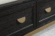 Ebony Finish, Panel Headboard and Storage Footboard, Vertical Accent Pattern for Headboard, Low Profile Footboard, 100% Solid Wood Construction, Brushed Stainless Steel Case Hardware, Felt Lined Top Drawers