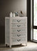 Off White Wood Finish, Replicated Wood Grain, Light Gray Upholstered Headboard, Button Tufting, Low Profile Footboard, Light Gray Case Fronts Accents, Brushed Black Drawer Handles