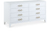 Bring unique elegance to your bedroom with this Bowtie dresser from Meridian Furniture. This dresser features eight drawers, providing you with plenty of storage space for clothes, linens, or miscellaneous objects. Its light color adds a touch of femininity to your living space, and its brushed bow tie handles complement your existing decor. Its flat top is perfect for placing a lamp, framed picture, books, bric-a-brac, and more.