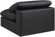 Give your space a whole new look with this Comfy vegan leather armless chair. This handsome chair fits nicely with other items in the Comfy collection and is a versatile seating option designed for adaptability, comfort and style. Wrapped in rich durable vegan leathered upholstery, this chair offers a plush embrace of overstuffed down feather cushions, carefully crafted to deliver the highest level of comfort. The perfect seat for creating an oasis for relaxation, this chair has thick foam surrounding its frame for added support and coziness.