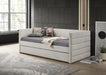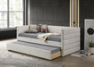 Ivory Microfiber Fabric, Squared Arms, Horizonal Side Design, Fully Slatted Top & Bottom, Mattress Ready, Equipped with Rollers Under Trundle