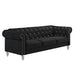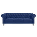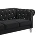 The New Classic Emma Chesterfield Velvet 3 Seat Sofa is a blend of soft elegance and sophisticated design. Crafted from 100% polyester velvet fabric, it offers cozy and indulgent seating for three. The glam tailoring features tufted backs and arms adorned with glimmering crystal buttons, adding a touch of luxury without compromising comfort. Upscale accents, including silver nailhead trim on the rolled arms and silver turned bun feet, enhance the velvet fabric. Shipped unassembled for easy placement in any home, its lower profile height makes it small space-friendly, fitting well into smaller rooms while providing full-size seating. Enjoy supportive seating with full foam cushions that provide ample comfort. Add a little sparkle in your home with the Emma Sofa.