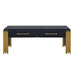 Introducing the Empire Coffee Table, a stylish and functional centerpiece for your living space. Crafted with durable eco-friendly materials and a sleek black finish, this table ensures long-lasting durability while adding a touch of contemporary elegance to your room. Its modern metro style, featuring gleaming gold tiered legs, evokes the enchanting allure of a city skyline under the stars. Enjoy convenient storage with two drawers, perfect for keeping remotes and other living room essentials organized and within reach. Elevate your living area with the Empire Coffee Table, where style meets practicality.