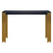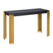 The EMPIRE Console Table in sleek black is a stylish and durable addition to your living space. Crafted with eco-friendly manufactured woods and decorative laminate, this table ensures lasting strength and durability. Its sophisticated black finish adds a touch of contemporary elegance to any room, while the modern metro style, featuring gleaming gold tiered legs, captures the enchanting ambiance of a city skyline shimmering under the stars. Elevate your space with the Empire Console Table, where sleek design meets long-lasting construction.