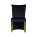 Introducing the Empire Dining Chairs, a luxurious addition to your dining space. Crafted with durable eco-friendly materials and upholstered in 100% midnight black polyester velvet fabric, these chairs enhance the contemporary ambiance of your collection. The expertly tailored channel back design, paired with gleaming gold layered legs, evokes the enchanting allure of a city skyline under the stars, adding a touch of sophistication to your dining area. Elevate your dining experience with the full-length upholstered chair back, boasting a curved design that sweeps to the floor for an elegant touch. Enhance your space with the Empire Dining Chairs, where modern metro style meets lasting comfort for a captivating ambiance.