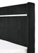 This bedroom collection strikes a balance between bold and classic styles. It features a striking bed with a high, textured headboard that commands attention. The accompanying case goods, including a dresser with a mirror, chest, and nightstand, are all finished in a sharp, black hue that adds depth and modernity to any bedroom. Each piece is accented with sleek metal handles that contrast beautifully against the dark finish. The clean lines and uncluttered design of the furniture allow for versatile placement in a variety of interior styles, from contemporary to transitional.