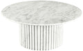 Add a refined look to your room with this handcrafted Genoa coffee table, a stunning masterpiece that marries elegance and practicality. Crafted from genuine travertine, each table is a unique work of art, featuring a travertine top with intricate white veining. The fluted travertine base adds a touch of art deco design, making it a statement piece in any room and adding to its heirloom-quality design.