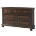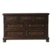 The dresser features seven spacious drawers, and one hidden in the top middle. An arched, bevel edge mirror completes this set.