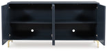 Elevate your aesthetic with the chic design of this accent cabinet. Sleek goldtone legs and striking doors with a geometric pattern infuse contemporary flair wherever you place this piece. Add a dark blue finish, and you've got a stunning showstopper. Providing function to form, the cabinet's push magnetic doors reveal two shelves and openings for electronics.