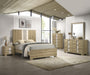 This bedroom set epitomizes modern luxury with its bold finish and striking contrast detailing. The bed’s commanding headboard features a chic marble-like accent and integrated lighting, creating an opulent focal point in the room. Complementary to the bed are the dresser and nightstands, each boasting a sleek silhouette and accented with the same marble finish, lending a cohesive and upscale look. The set's clean lines are softened by the warm undertones of the accent pieces, while the silver hardware on each drawer adds a glint of sophistication.