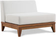 Create the outdoor living group of your dreams with this Rio outdoor off-white water resistant fabric modular armless chair. Designed for seamless integration between every item in the Rio collection, this chair features construction with premium materials, including solid acacia wood, so you can count on it lasting for many seasons into the future. The contemporary design makes this unit a great addition to your outdoor entertaining setup.