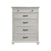 The Silver Sands Chest is built with durable, quality construction using solid pine, manufactured woods, and oak wood veneers, ensuring a strong and stable piece. Its transitional style blends clean, simple lines with a rustic wood finish, creating a calm and inviting atmosphere. The misty gray finish, applied through a meticulous multi-step process, offers a light, weathered look that highlights the natural grain and mineral patterns of the wood. Elegant design features, including a raised base, full return and dentil moldings, and contrasting hardware, add a sophisticated touch. Heirloom-quality drawers with dovetail joinery and three-stage steel ball glides ensure smooth, full-extension operation and can support heavy loads. With five spacious drawers, including a velvet-lined top drawer to protect delicates, this chest provides ample storage for clothing essentials. Combining style, durability, and functionality, this chest is a practical and elegant addition to any bedroom.
