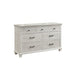 The Silver Sands Dresser combines durability and quality construction, crafted from solid pine, manufactured woods, and oak wood veneers for a strong and stable piece. Its transitional style merges clean, simple lines with a rustic wood finish, creating a calm and inviting atmosphere. The misty finish, achieved through a meticulous multi-step, hand-applied process, offers a light, weathered look that highlights the natural grain and mineral patterns of the wood. Elegant design features, including a raised base, full return and dentil moldings, and contrasting hardware, add a sophisticated touch. Heirloom-quality drawers with dovetail joinery and three-stage steel ball glides ensure smooth, full-extension operation and can support heavy loads. With seven spacious drawers, including velvet-lined top drawers to protect delicates, this dresser provides ample storage for clothing essentials. Combining style, durability, and functionality, this dresser is a practical and elegant addition to any bedroom.