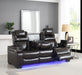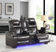 Air Gel Leather, Dual-Sided Power Recliner, Power Adjustable Headrest, LED underlit, Wireless Charging, Bluetooth Speaker, One-Touch Power Controls with Adjustable Positions, Flip-Top Storage and Stainless-Steel Cup Holders, USB and Type C Charging Port Equipped, Drop-Down Table with AC Power Reenforced Steel Reclining Mechanism, Air Gel Leather, Tightly Knit Contrast Stitching, Power Adjustable Headrest, Side Arm Storage LED Underglow, USB and Type C Ports, Diamond Accented Stitching, Stainless Steel Cup Holders, Reenforced Steel Reclining Mechanism