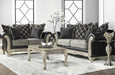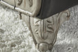 Hand Carved Stone Color Wood Trim, Dark Gray Fabric Woven Seat Cushions, Certi-Pur Foam Cushions, Black Faux Leather Arms, Black Pillow Accents, & Reversible Pillows, Coordinates with the T202 Tables