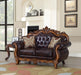 Espresso Brown Air Gel Leather, Hand Carved Wood Trim Accents, Roll Arms, High Density Foam Cushion Seating, Hardwood/Plywood Mix Construction, Button Tufted Back, Traditional Style Design