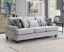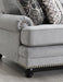Light Gray Chenille Fabric, Roll Arms, High Density Foam Cushion Seating, Hand Applied Nail Head Trim, Multi Color Accent Pillows, 100% Solid Wood Frame