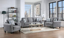 Light Gray Tightly Woven Material, Roll Arms, High Density Foam Cushion Seating, Multi Color Accent Pillows, Black Plastic Legs