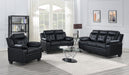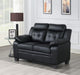 Black PU Leather, Tight Seat Cushions, Tufted Back Cushions, Pillow Top Arms and Headrest, Brown Plastic Legs, Backs Detach for Easy Delivery