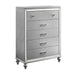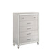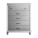 The Valentino 5 Drawer Chest is a testament to enduring craftsmanship crafted from a blend of manufactured and solid woods, adorned with exquisite embossed inlays. Radiating with glitz and glam, its gleaming finish, mirrored trims, crystal-studded drawer pulls, and alligator-embossed accents capture the essence of Hollywood allure. Delight in its thoughtful details, from heirloom-crafted English dovetailed drawers with snag-free interiors to smooth full-extension ball-bearing glides. With an abundance of storage, this chest offers ample space to organize your clothing and belongings effortlessly. Experience luxury and functionality combined in this distinctive piece—a must-have addition to any bedroom sanctuary.
