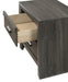 This bedroom collection encapsulates a blend of contemporary design and rustic charm. The centerpiece, a bed with a distinguished chevron patterned headboard, evokes a sense of craftsmanship and texture, infusing the space with character. Flanking the bed are matching pieces, each exhibiting clean lines and a finish that suggests a lived-in elegance. The dresser, complemented by a substantial mirror, along with the tall chest, offer ample storage solutions with understated metal handles that enhance the modern farmhouse aesthetic. A nightstand completes the set, its compact design making it a practical addition to the suite.